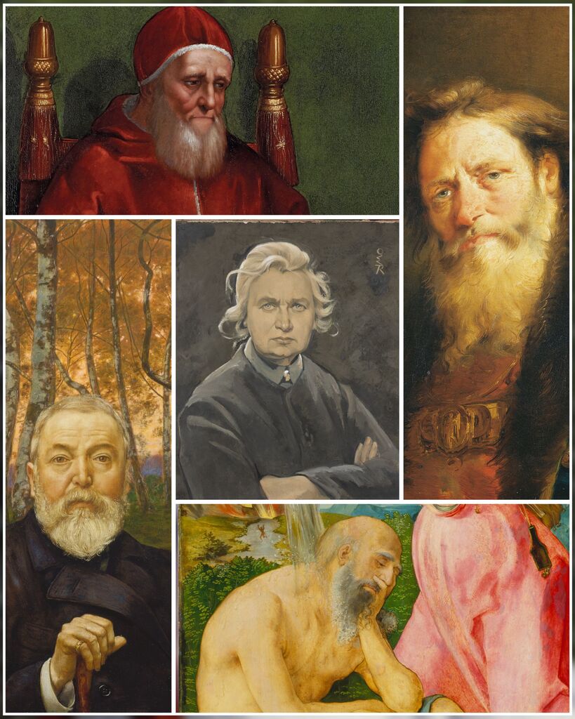 Ein besonderes Zeichen in vielen Bildern war der Bart. Er stand für Weisheit und Stärke. Zum Beispiel Papst Julius II.: Sein Bart zeigte, dass er ein mächtiger Politiker war. Ein anderes Beispiel ist die Malerin Ottilie W. Roederstein. Im Jahr 1926 malte sie sich selbst. Sie zeigte sich als unabhängige Frau. Mit grauen Farben und verschränkten Armen wirkte sie stark und nachdenklich. Die Kunstgeschichte zeigt also viele verschiedene Bilder vom Alter – mal traurig, mal stark, mal nachdenklich.