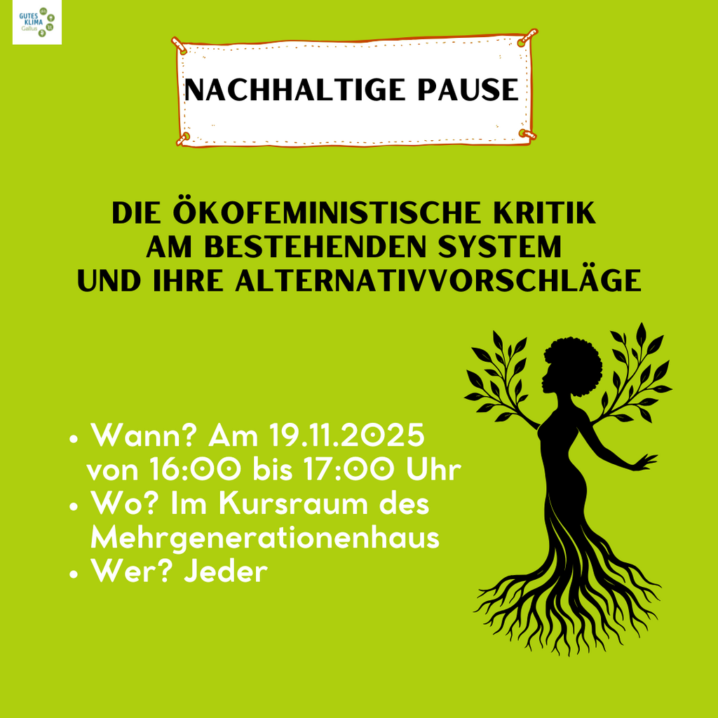 In dieser Nachhaltigen Pause geht es um die ökofeministische Kritik am bestehenden System und ihrer Alternativvorschläge. Ökofeminismus ist viel mehr als Ökologie + Feminismus. Es ist eine Vision für Gerechtigkeit und Nachhaltigkeit. Was sind die Hauptkritikpunkte dieser Bewegung zum derzeitigen System? Welche Alternativvorschläge macht sie? Komm gerne in dieser nachhaltigen Pause, um mehr Einblicke davon zu bekommen und in den Austausch zu kommen! Wir freuen uns über euren Besuch!