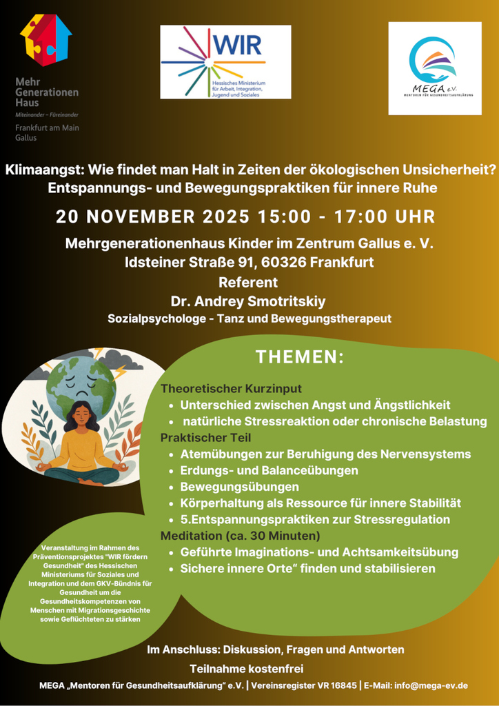 Erfahren Sie vom Referenten Dr. Andrey Smotritskiy (Sozialpsychologe – Tanz- und Bewegungstherapeut), was Klimaangst überhaupt ist und welche Symptome typisch sind. Außerdem wird Ihnen mit Entspannungs- und Bewegungspraktiken für innere Ruhe gezeigt, was Sie gegen Klimaangst tun können.