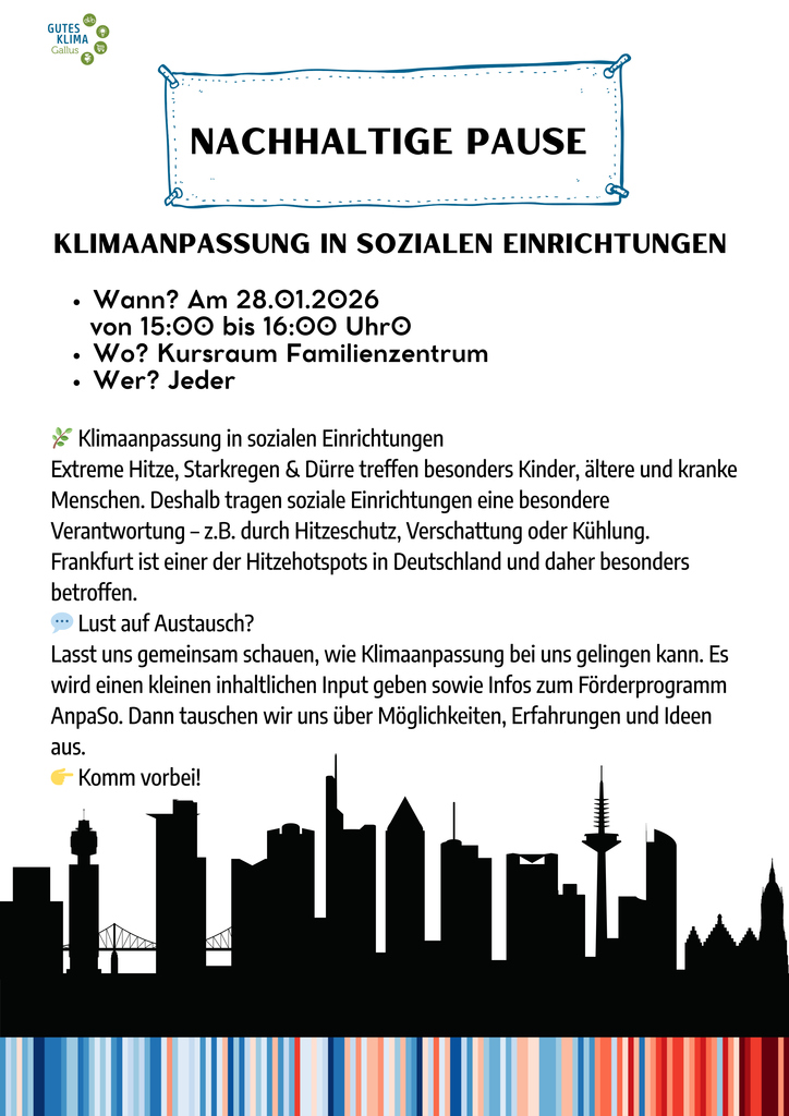 In dieser Nachhaltigen Pause geht es um die Klimaanpassung in sozialen Einrichtungen. Komme gerne zu dieser nachhaltigen Pause, um mehr Einblicke davon zu bekommen und in den Austausch zu kommen! Wir freuen uns über deinen Besuch!