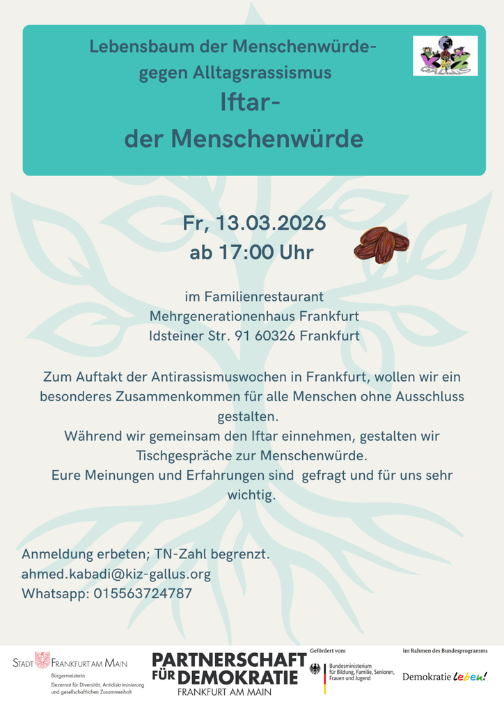 Im Rahmen der Internationalen Wochen gegen Rassismus 2026 laden wir Sie sehr herzlich zum Iftar (Fastenbrechen) ein und freuen uns auf Ihre Teilnahme.