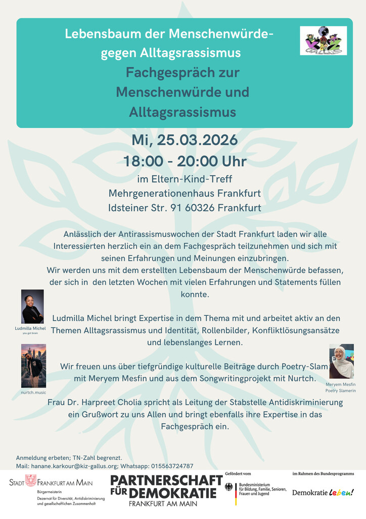 Im Rahmen der Antirassismuswochen der Stadt Frankfurt laden wir herzlich zu einem offenen Fachgespräch ein. Gemeinsam sprechen wir über Menschenwürde, persönliche Erfahrungen und den Umgang mit Alltagsrassismus.